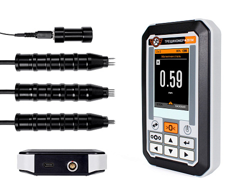 В трещиномере реализуется электропотенциальный метод на переменном токе, который позволяет оперативно и точно измерить глубину трещины от 0,5 до 100мм. С помощью токовых электродов в области измеряемого дефекта пропускается постоянный ток частотой 1 кГц. С помощью приемных электродов и электронного блока определяется напряжение, возникающее в результате прохождения тока по стенкам дефекта, которое пропорционально глубине дефекта.
