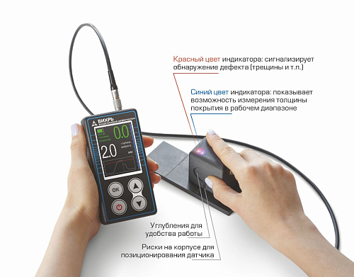 Прибор рассчитан на применение в лабораторных, цеховых и полевых условиях различных отраслей промышленности. Дефектоскоп имеет звуковую и световую сигнализацию при обнаружение дефекта и световую сигнализацию о допустимом диапазоне измеряемого покрытия.По условиям эксплуатации в части воздействия климатических факторов внешней среды прибор относится к исполнению УХЛ категории 1.1 ГОСТ 15150-69.